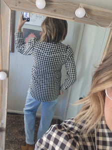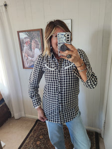 Introducing the Howdy Hanny Puff Pearl Snap Top, a must-have for any cowgirl with its charming gingham pattern and vintage aesthetic. Made with puff sleeves for added flair, this top exudes punchy charm. Perfect for those who want to make a statement with their style.