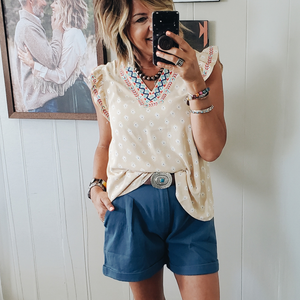 Notched V neck with embroidered details