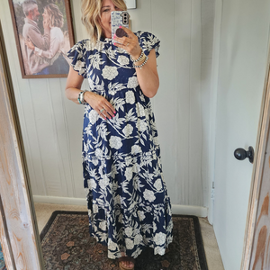Flower print ruffled neck and sleeves maxi dress